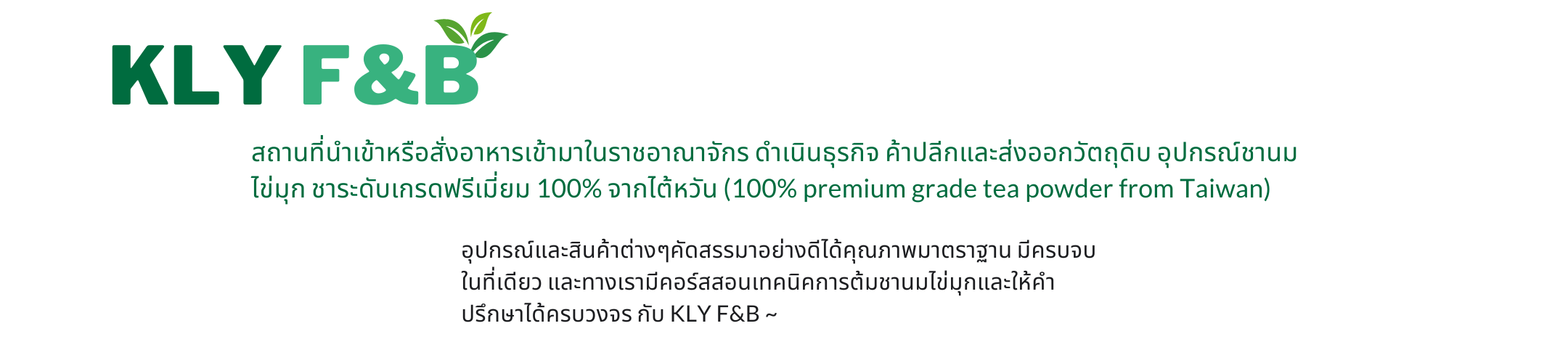 ยินดีต้อนรับเข้าสู่ K L Y F&B CO.,LTD (เคแอลวาย เอฟแอนด์ บี จำกัด) สถานที่นำเข้าหรือสั่งอาหารเข้ามาในราชอาณาจักร ดำเนินธุรกิจ ค้าปลีกและส่งออกวัตถุดิบ อุปกรณ์ชานมไข่มุก ชาระดับเกรดพรีเมี่ยม 100% จากไต้หวัน (100% premium grade tea powder from Taiwan) อุปกรณ์และสินค้าต่างๆคัดสรรมาอย่างดีได้คุณภาพมาตราฐาน มีครบจบ ในที่เดียว และทางเรามีคอร์สสอนเทคนิคการต้มชานมไข่มุกและให้คำปรึกษาได้ครบวงจร กับ KLY F&B